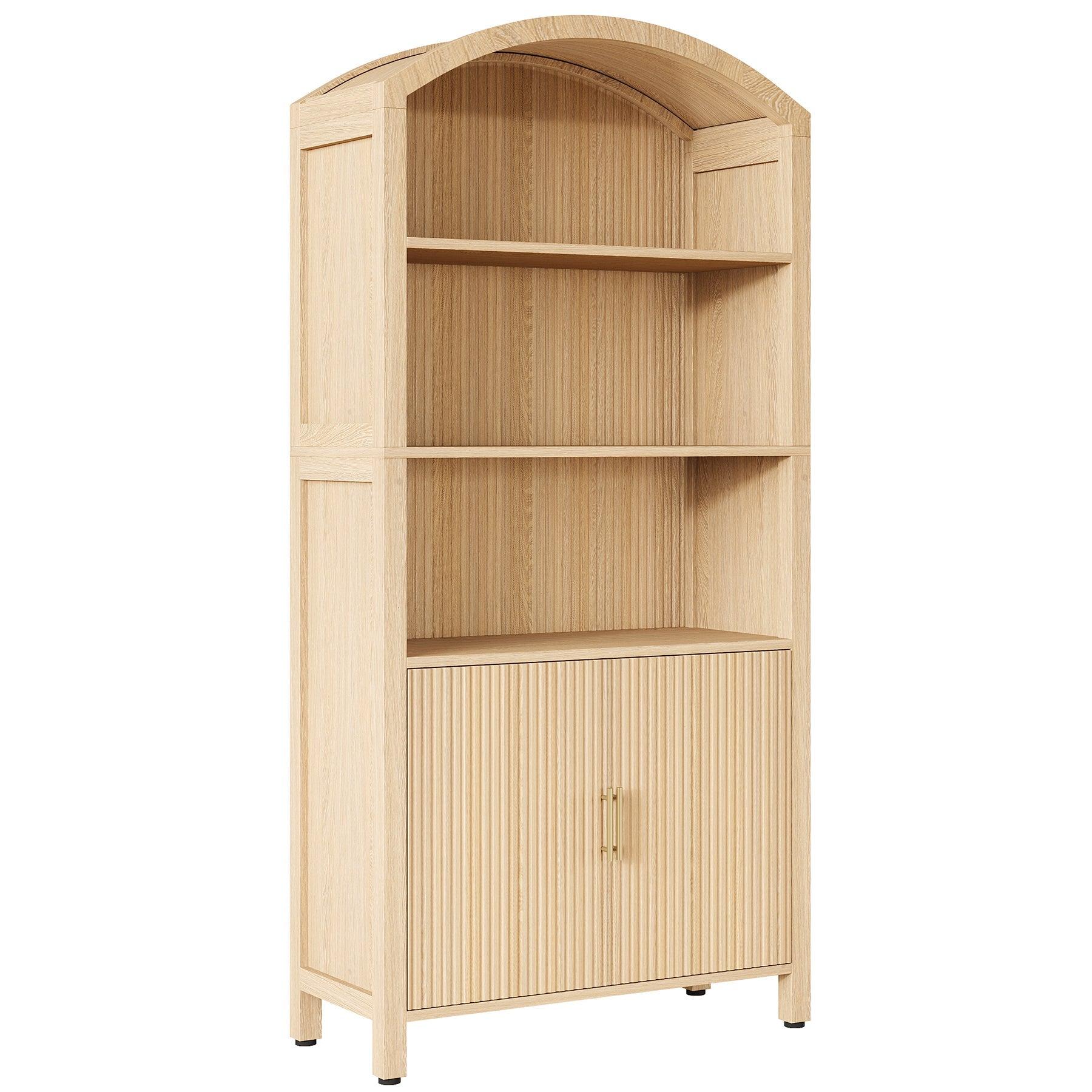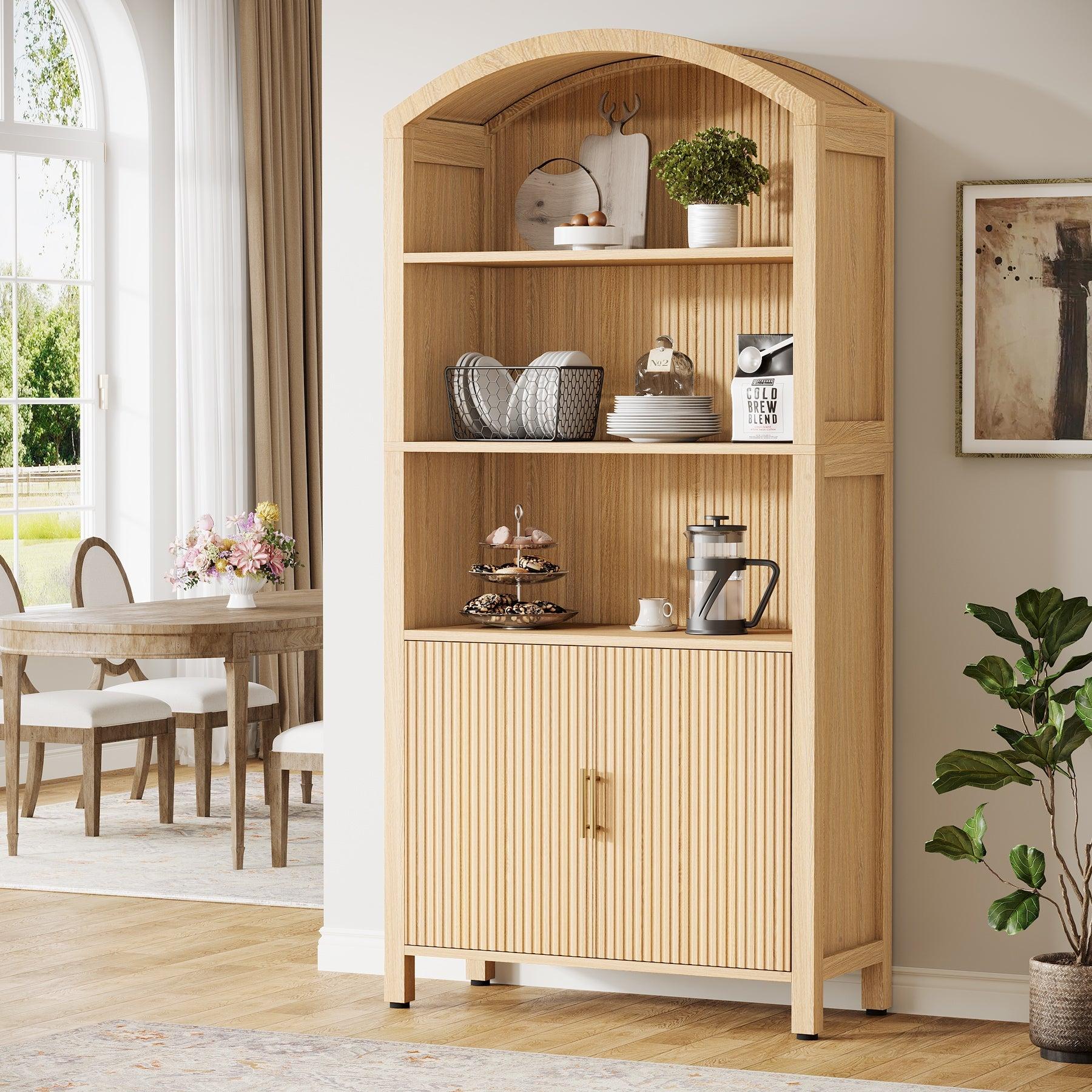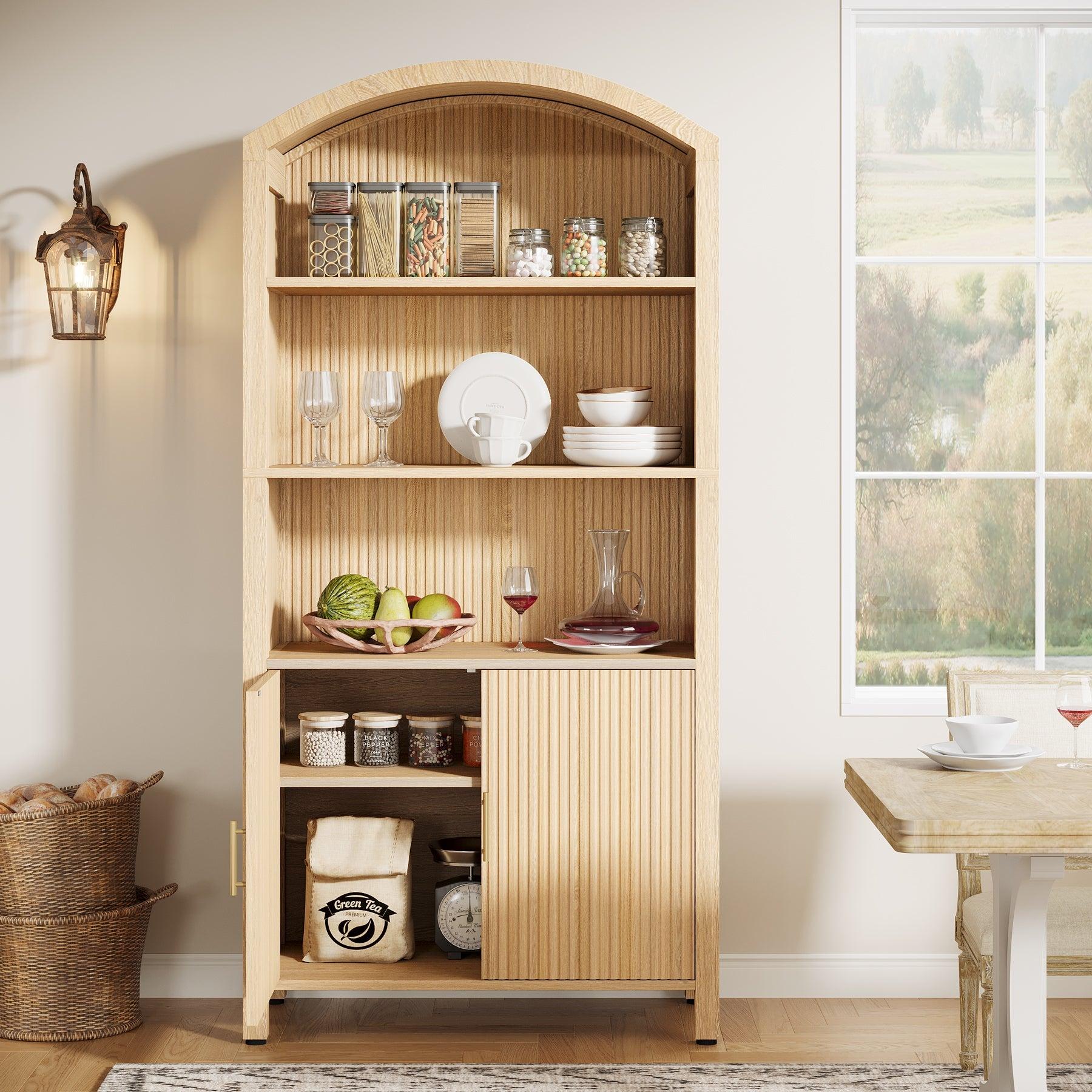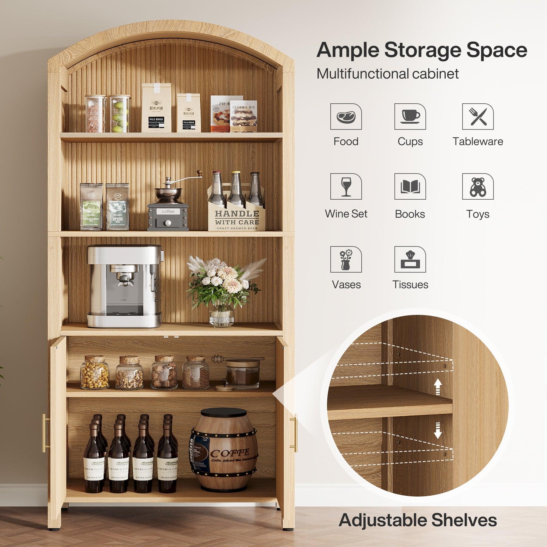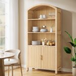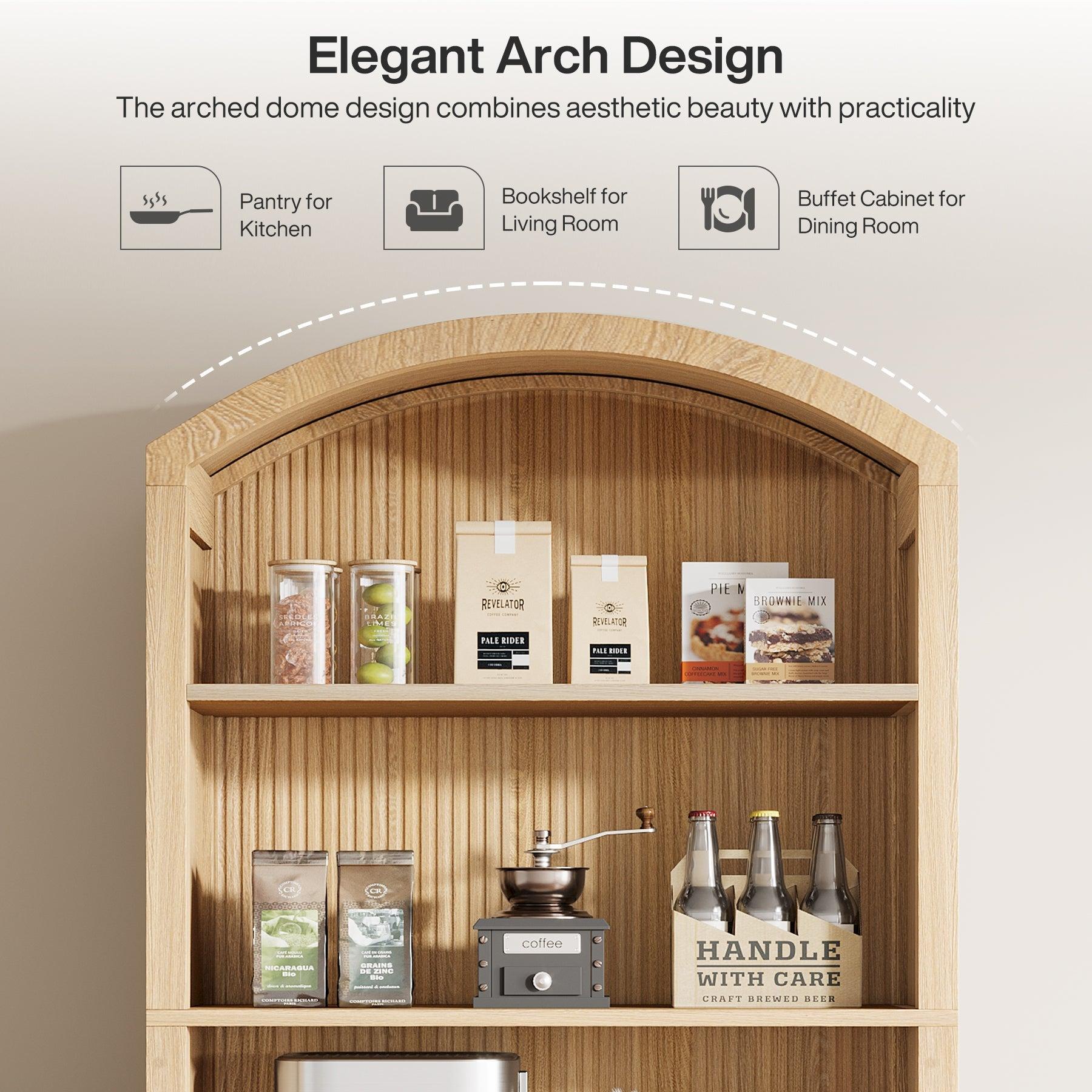 Sleek Mid-Century Modern Pantry Cabinet – This stylish kitchen storage piece features a natural wood grain finish and a graceful arched design, making it a perfect match for any kitchen decor. Its timeless look elevates your space while keeping everything organized. ?